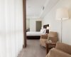 Suite com vista panorâmica para o jardim, com uma área de 35 m2, cama King Size (2.00 x 2.00) e possibilidade de colocar cama extra.