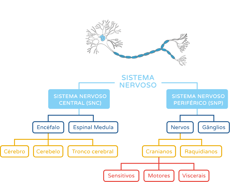 O sistema nervoso é composto por dois subsistemas interligados, que coordenam a informação entre o exterior e o corpo, o sistema nervoso central (SNC) e o sistema nervoso periférico (SNP).